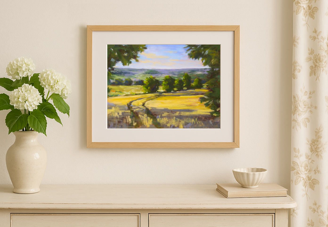 "Ombres sur le blé", pastel sec sur papier Pastelmat, 40x30cm, œuvre originale signée Florian Rouliès. Le tableau représente un champ de blé en fin d'après-midi, dans la vallée du Vern, en Périgord. Vendu sans cadre.
